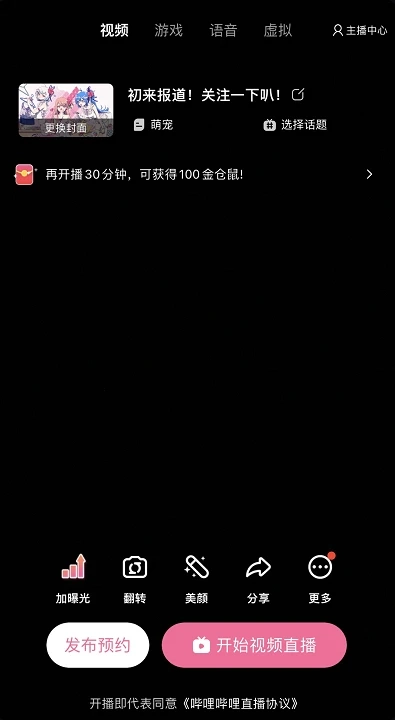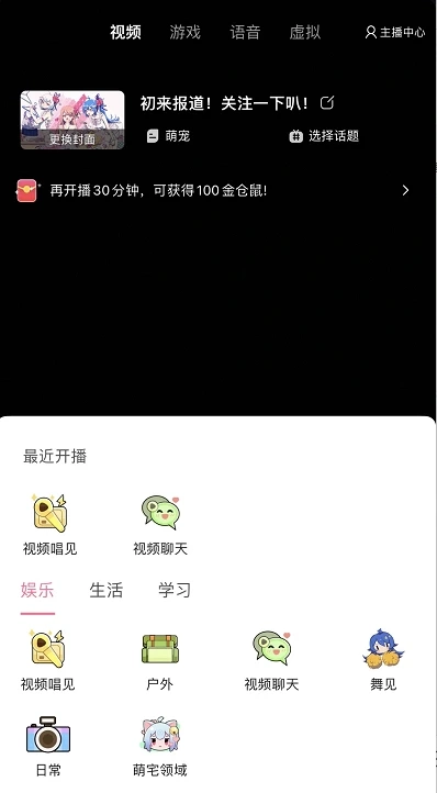 TAB栏选择开播模式,根据开播内容划分为视频、游戏、语音、虚拟开播
