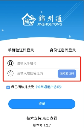 “锦州通”提供两种登录方式,第一种使用【手机号+验证码】登录,如图1-2-1所示,第二种使用【身份证号+密码】登录。