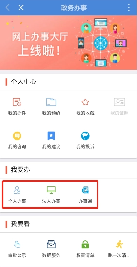 进入后依需求选择【个人办事】、【法人办事】或【办事通】