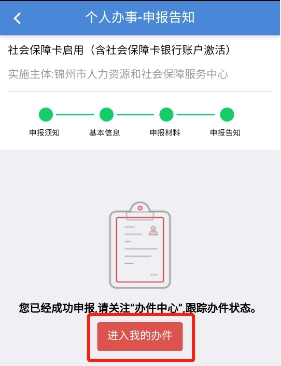 查询业务的办理进度有两种方式,第一种业务提交之后,点击【进入我的办件】,如图所示;第二种点击【我的】→【我的办事】,如图所示。