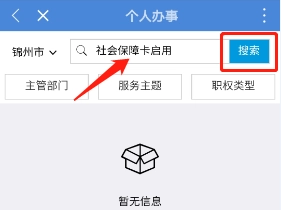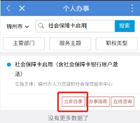 在搜索栏输入社会保障卡启用,点击【搜索】→【立即办事】