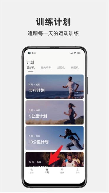 3、点击“计划”选项卡可查看并选择不同阶段的训练计划,支持个性化定制。