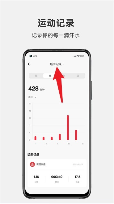 5、进入“运动记录”页面可按日、周、月查看累计运动时长及历史训练详情。