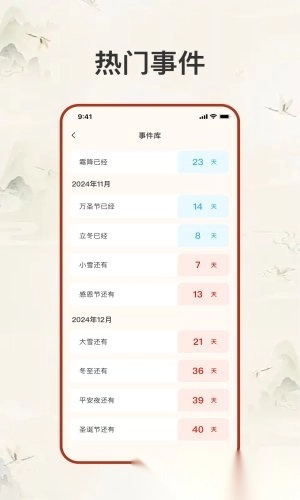 1)软件已自动记录一年中的各个重要节日,像冬至、圣诞节、万圣节等,无需你再费时自行记录。