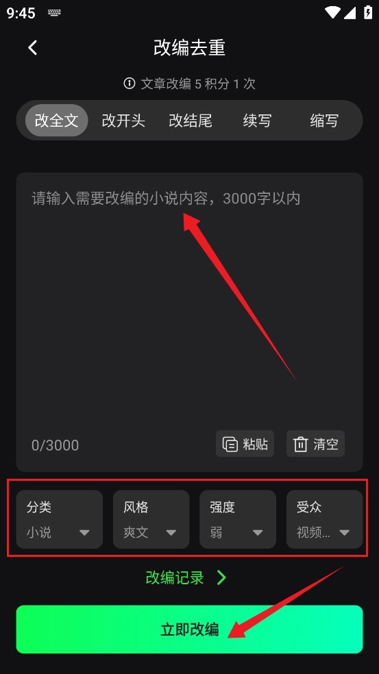 7、而且软件支持改编去重,如图所示,在输入框中输入需要改编的小说内容并选择分类、风格、强度、受众等属性,点击立即改编即可。