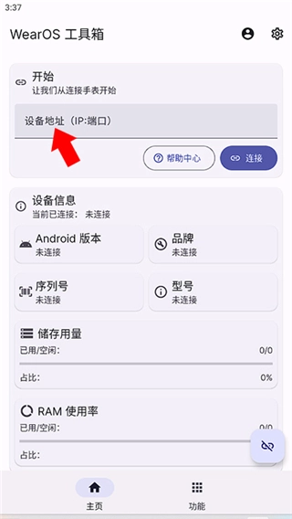 5、接着安装wearos工具箱软件,保证两台设备在同一wifi下,并在首页输入“通过WLAN调试”下方出现的ip地址以及端口完成连接。