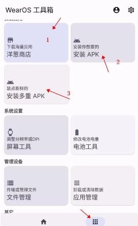 1. 开启WearOS工具箱App,待通过工具箱与手表成功连接后,点击功能栏。其中,第一项为洋葱商店,第二项是安装本地apk,第三项是多重apk 。