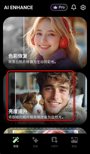亮度提升:自动调整光线不佳的照片,自然提升亮度和清晰度。