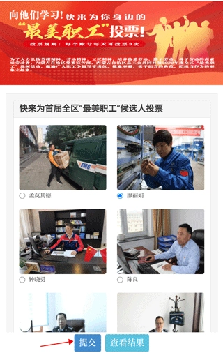 2、进入投票界面后,选择其中一位,点击下方的“提交”即可投票成功。