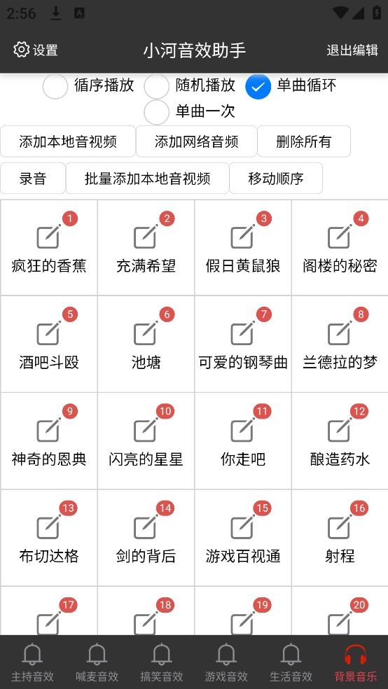 1、自定义音效,可以添加手机上的音频或视频文件作为音效