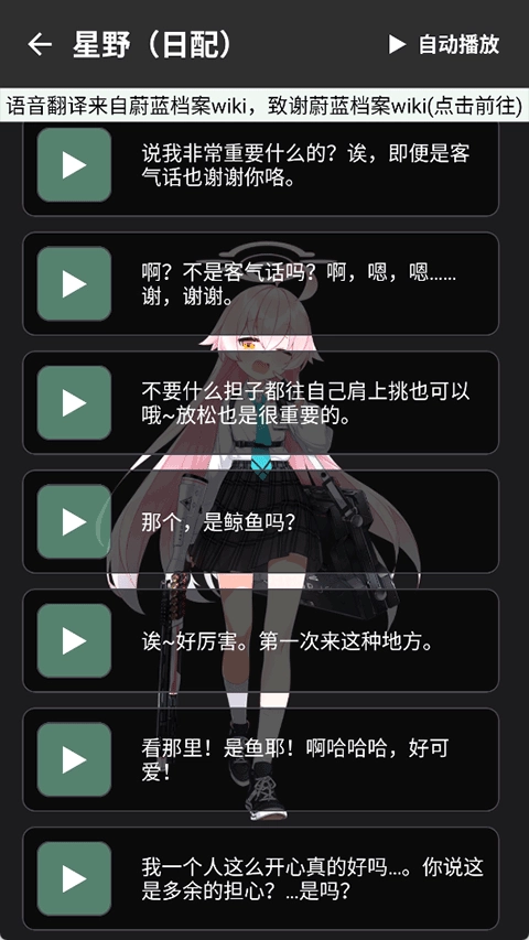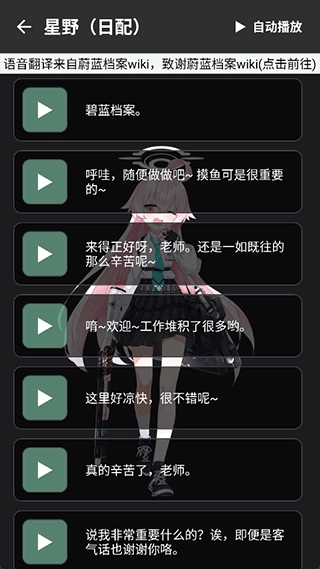 3、收录了蔚蓝档案中绝大部分的语音包,日配,中配等都有,包括日常对话,战斗语音等。