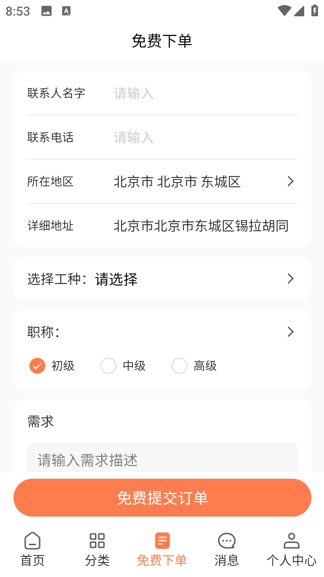 2、打开【免费下单】界面,输入相关信息,确认后点击【免费提交订单】按钮即可。