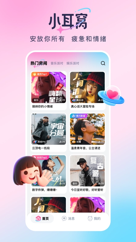 小耳窝,这是一款超棒的语音交友软件,无论何时,你都能在这儿倾诉烦恼,收获更多欢乐。平台上聚集了众多声音悦耳的男女,让我们能随时互动。只需一键,就能浏览那些你感兴趣的声音房间,快和有趣的Ta畅聊吧!在这里,各种话题可实时表达,无聊瞬间消散。而且,还能尝试开启群聊模式,与更多人来一场火热的互动。