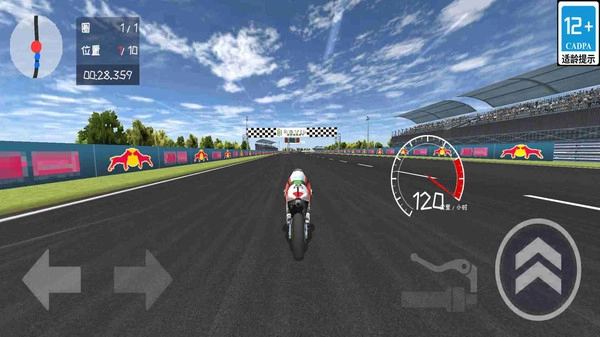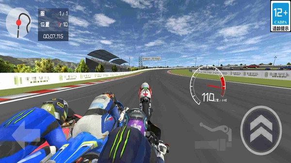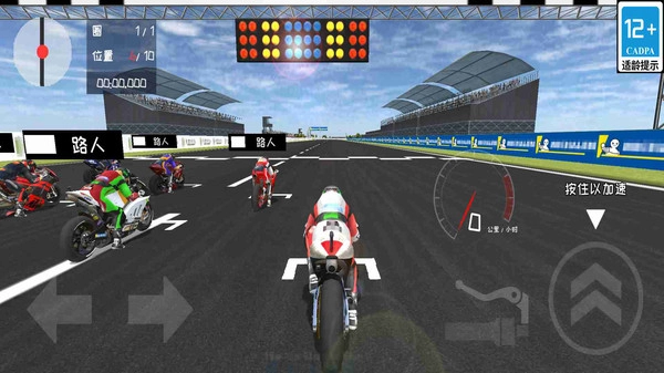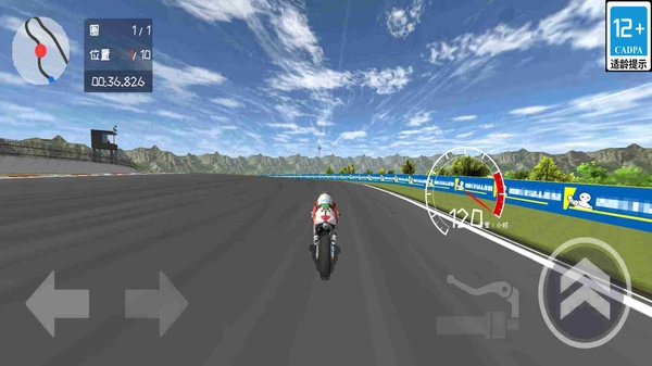 1.在比赛中,玩家通过屏幕左下方的方向箭头控制摩托车的左右移动,精准操作转向以确保在弯道中保持最佳速度与稳定。