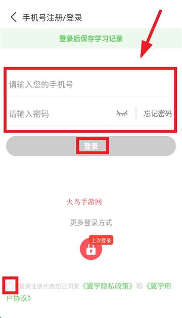输入手机号,密码,勾选登录注册代表您已同意 《翼学隐私政策》 和 企 《翼学用户协议》,点击登录即可