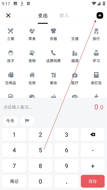 2、在支出页输入完成信息后,点击右上角【+】添加专属支出分类。