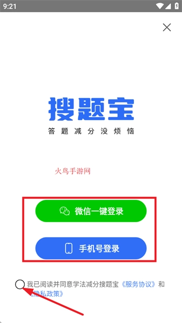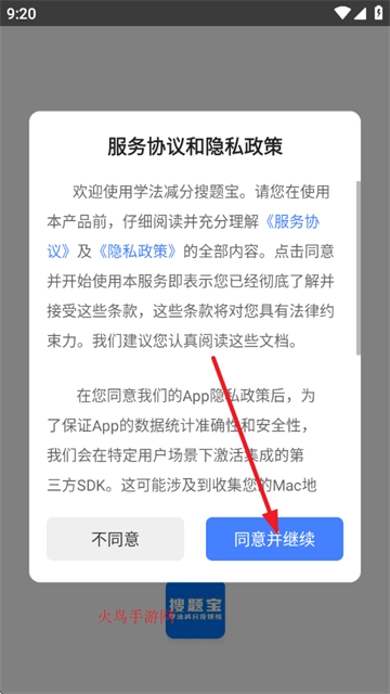 首先打开学法减分搜题宝,阅读并同意“服务协议和隐私政策”;