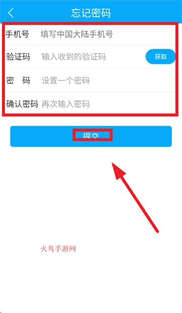 请依次输入手机号、验证码以及新密码,完成后点击“提交”按钮即可。