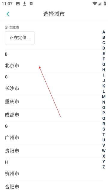 1、在选择城市页面,你可以选择【定位城市或手动选择城市】。