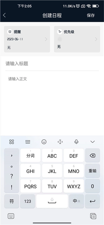 3、然后就可以创建日程了,输入标题和正文,并且设置提醒时间和优先级,最后点击保存即可。