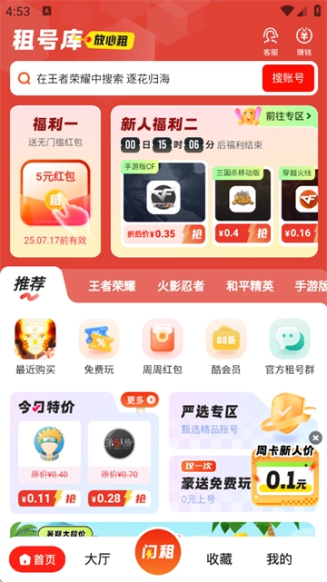 租号库平台安全便捷可靠,新人免费体验,注册即可领取红包。本平台提供竞技、MOBA、RPG等全品类热门的游戏体验服务。