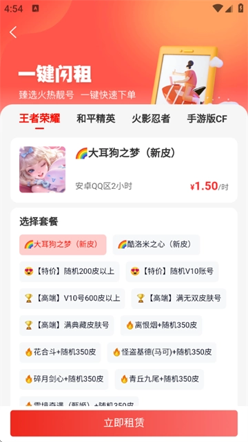 3、找到心仪账号后即可实时在线租号并一键上号体验;