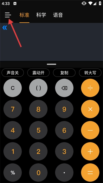 1、在计算器标准页面,点左上角菜单图标,展开功能菜单。