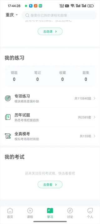2、进入到学习页面,点击我的练习下方的“历年试题”选项;