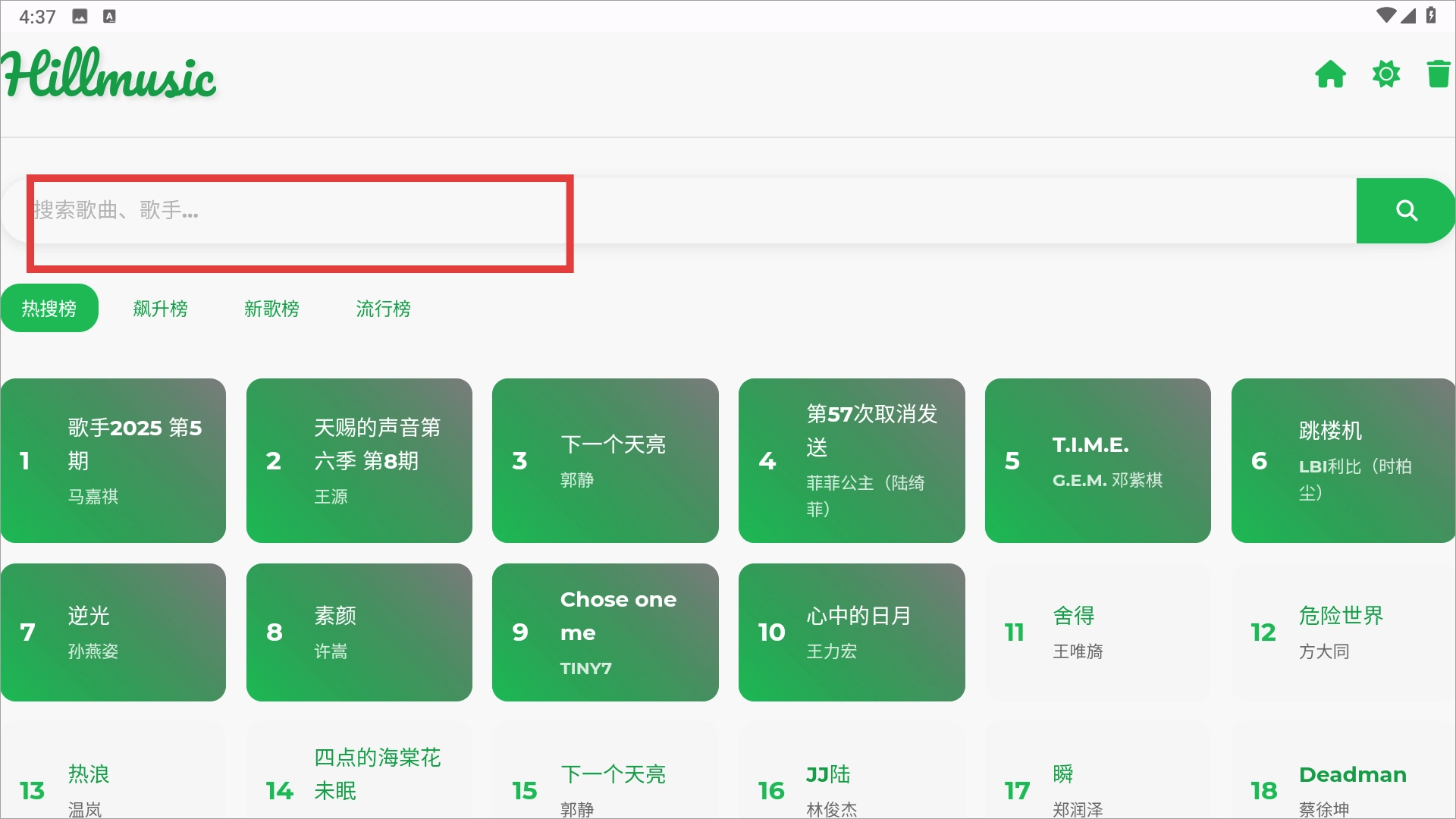 2、打开进入软件,在首页的搜索框直接搜索喜欢的歌曲名,或者音乐家,歌曲类型等