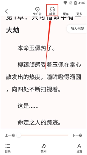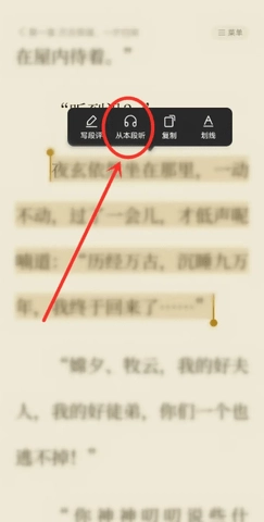 2、点击进入阅读页面,点击屏幕,在弹出的功能栏中点击上方的听书选项