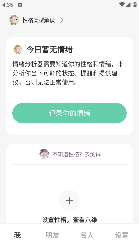 2、在主界面中,用户可记录当前的情绪变化以及性格测试、解析等等
