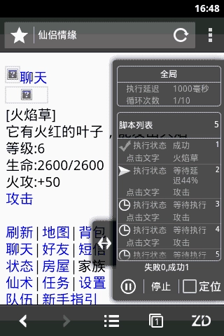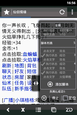 11、第五个脚本执行成功,浏览器点击了“火焰草根”,捡起了怪物掉落的物品