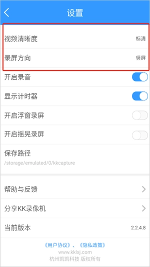 3、在设置里可以自由选择录屏的清晰度与方向。