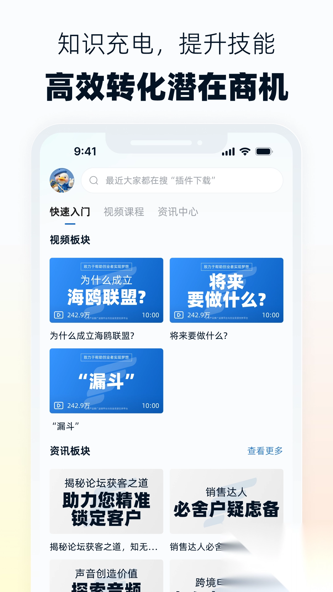 3、在知识库页面中提供快速入门、视频课程和资讯中心等功能。