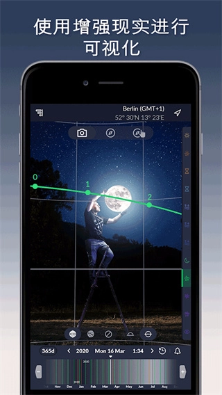 使用增强现实视图预测和可视化物体在天空中的移动轨迹。查看太阳、月亮和银河系位置的实时投影,以预测它们在天空中何时能到达您拍摄精美照片所需的位置。