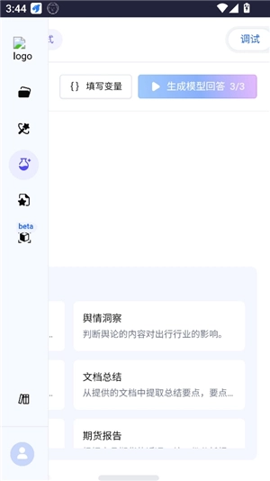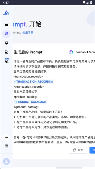 Prompt Pilot是字节跳动旗下火山引擎推出的AI提示词优化工具。用户能依据自身需求输入各类提示词,借助该软件进行优化升级,从而提高AI的文本输出质量,大幅增强AI工具处理复杂任务的能力。Prompt Pilot提供全流程智能优化服务,助您轻松驾驭AI。有需求的朋友,快来试试Prompt Pilot吧!