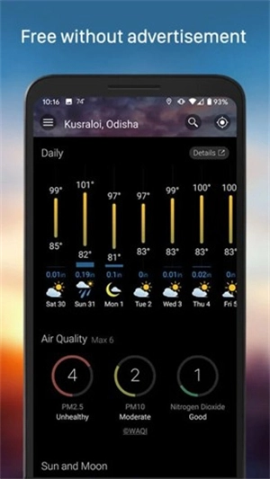3、空气质量监测:查看实时PM2.5、紫外线指数、花粉浓度等数据。