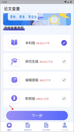 1、开启软件,首页呈现多种查重类型,像本科版、研究生版、编辑部版、职称版等,依据自身需求勾选对应的版本。