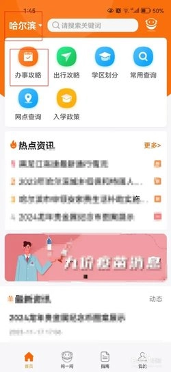 第一步:打开手机本地宝软件,点击选择【哈尔滨】,然后点击【办事攻略】