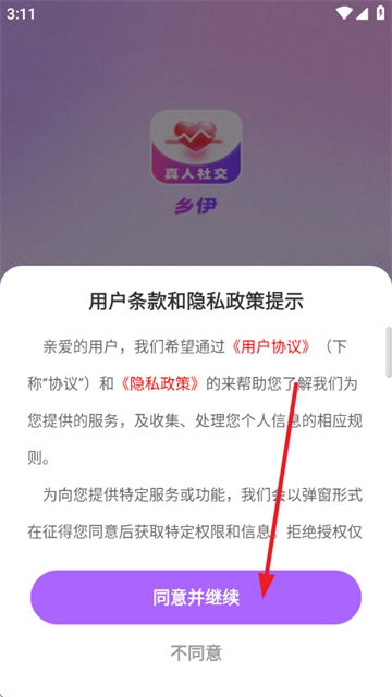 1、首先打开乡伊,点击同意并继续选项;