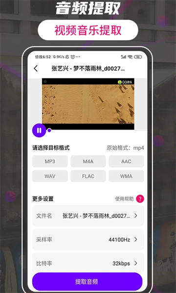 4. 提取音频:把想要背景音乐的视频选择,可以选择格式转换成音乐,支持导出MP3,M4A,AAC,WAV,FLAC,WMA等格式;