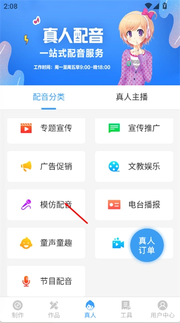 2、在真人配音页面中选择“模仿配音”功能,进入角色配音设置流程。