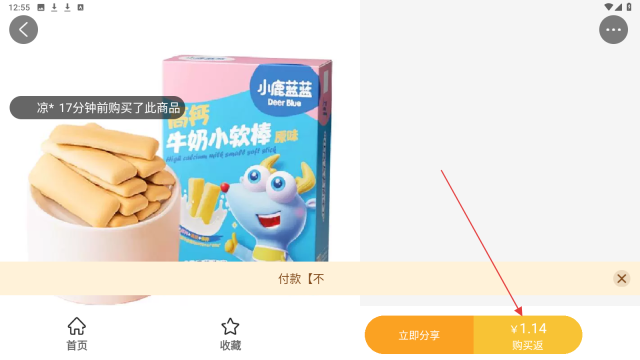 3、购【小鹿蓝蓝-高钙牛奶小软棒】,付款后点【购买返】,可查返利金额。