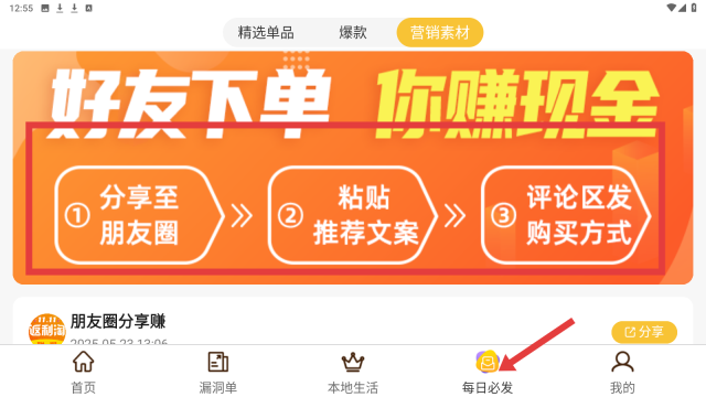 4、点【每日必发】,按【分享至朋友圈】【粘贴推荐文案】等步骤,分享商品赚现金。