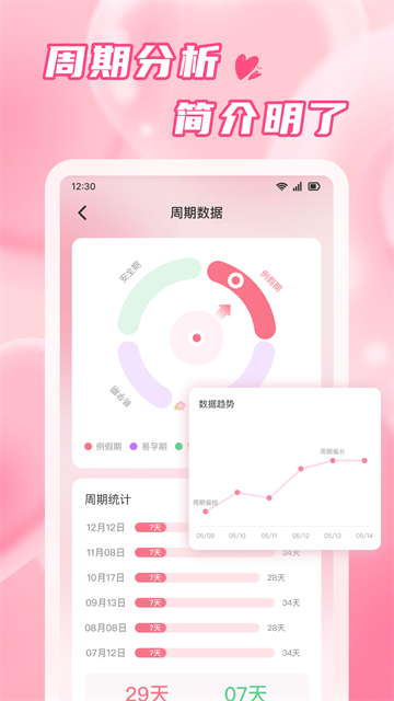 5、周期数据:软件也可以将经期的周期数据进行展示,用户也可以查看每个月的周期时长;