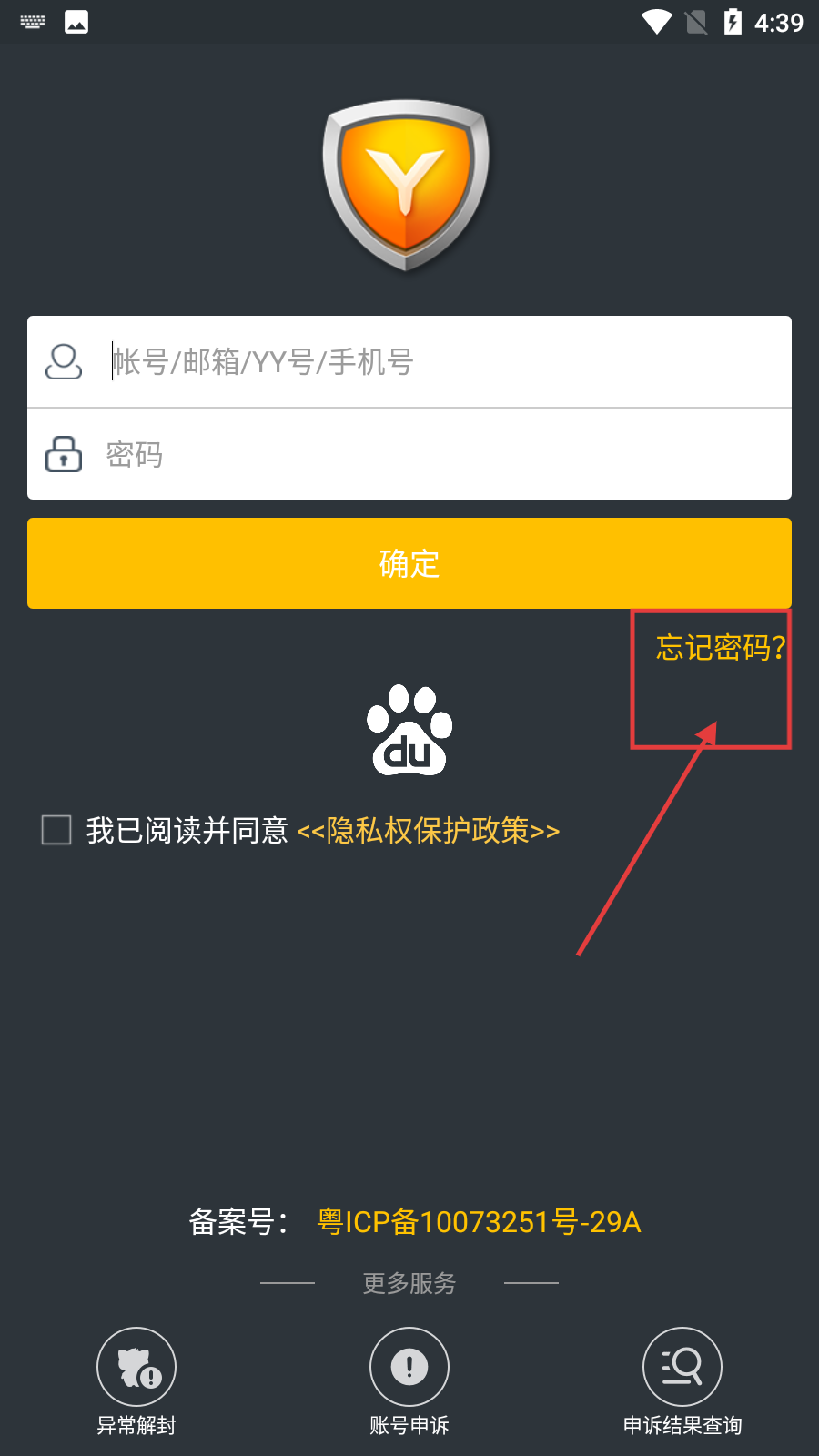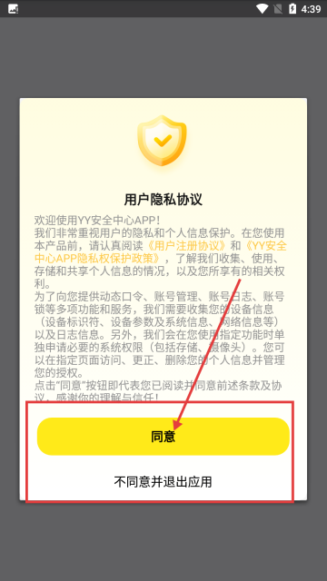 1在使用YY安全中心之前,你需要阅读《用户注册协议》,只有点击【同意】之后,才能够使用该安全中心。