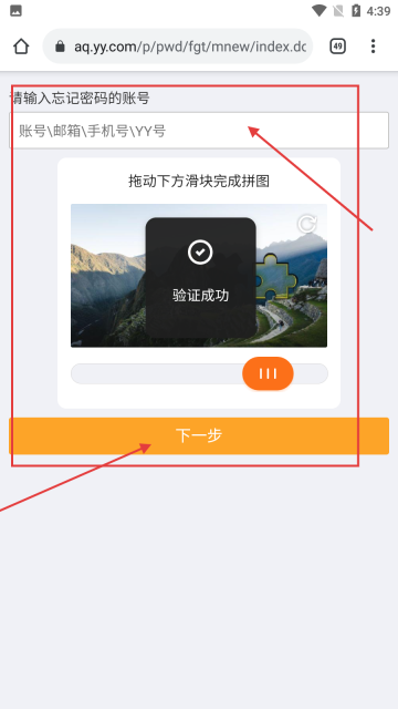 3、进入密码找回界面,填入账号,完成拼图验证,接着点击【下一步】,以继续进行密码找回操作。