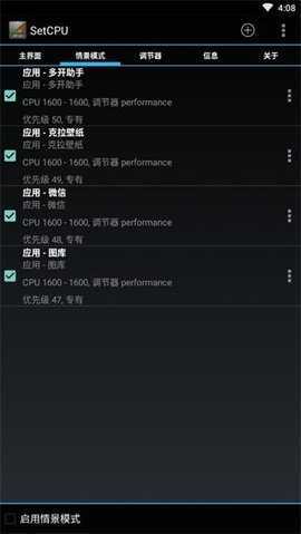 在情景模式的设置里挑选不同的使用场景,软件会自动对CPU频率进行调整,从而适配当前所处的环境。