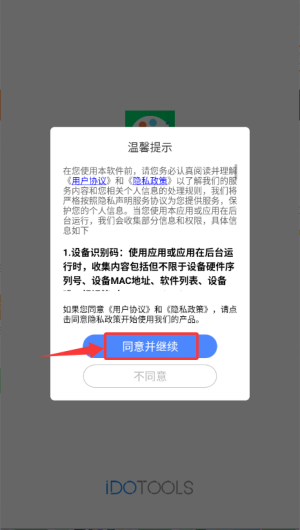 1、首次启动应用,请在温馨提示弹窗点击同意并继续。