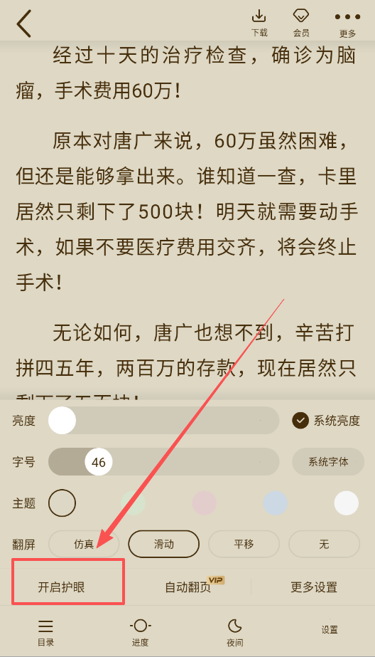 3进入阅读界面后,屏幕下方的菜单可供你调节亮度与字体大小,其中字号拥有46级调节选项,你总能从中找到让自己感到舒适的尺寸。